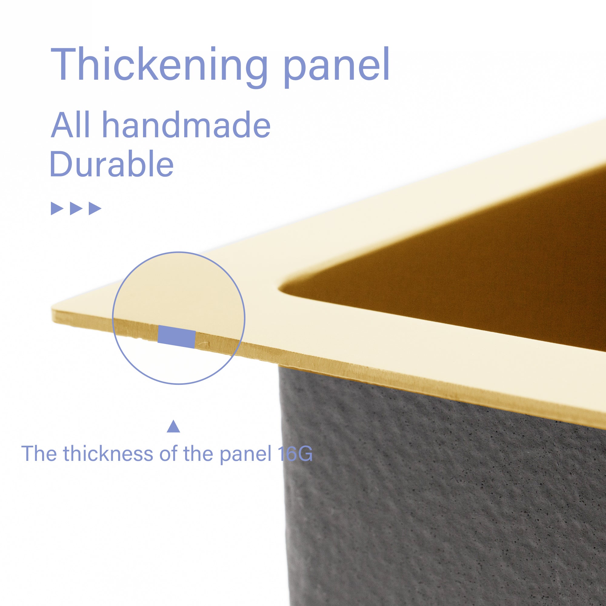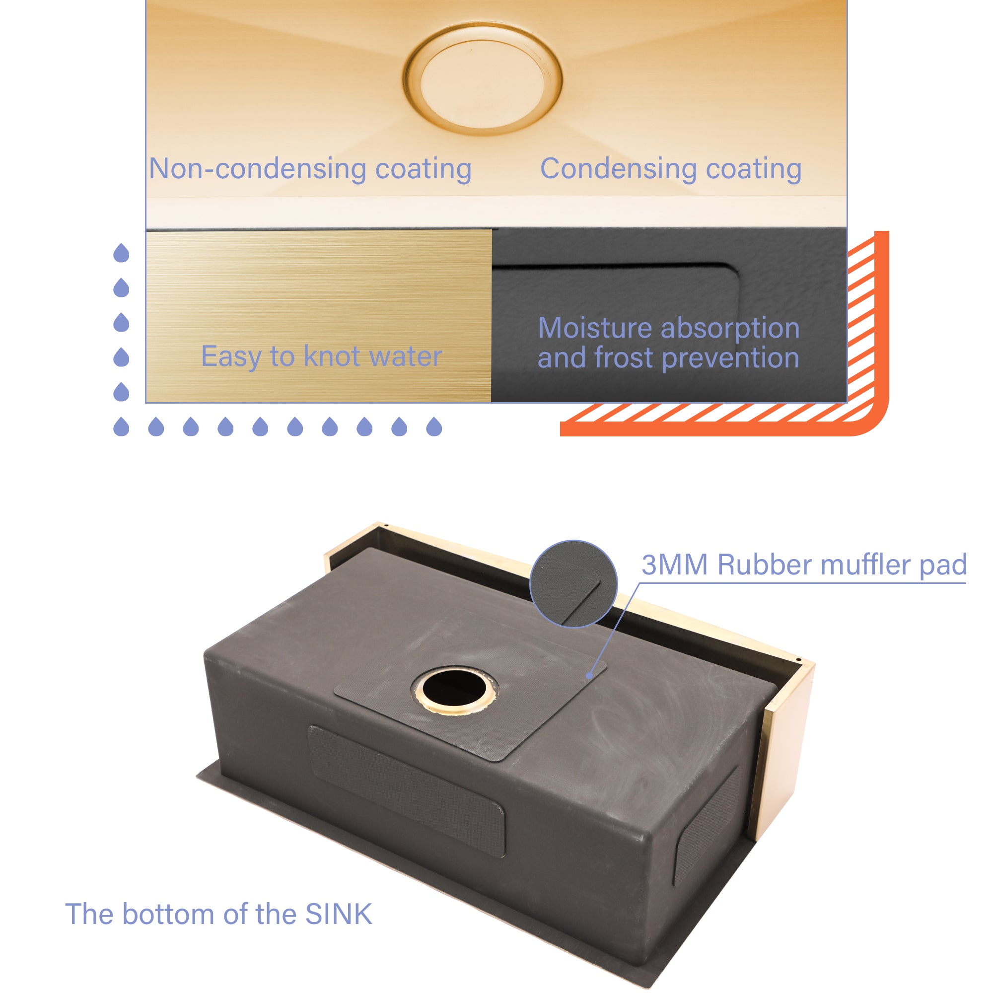 • This 33" Farmhouse Sink is Made of Dent-resistant T304 Stainless Steel in 16-gauge. the Gold Finish is Applied As an Outer Layer Using an Innovative Nano-PVD Technique, Anti-physical Scratching, Anti-pot Bowl Bump, No Water Trace Left, Very Easy to Clean, Anti-freezing Heat and Non-seepage Water, long Lasting and Durability.
