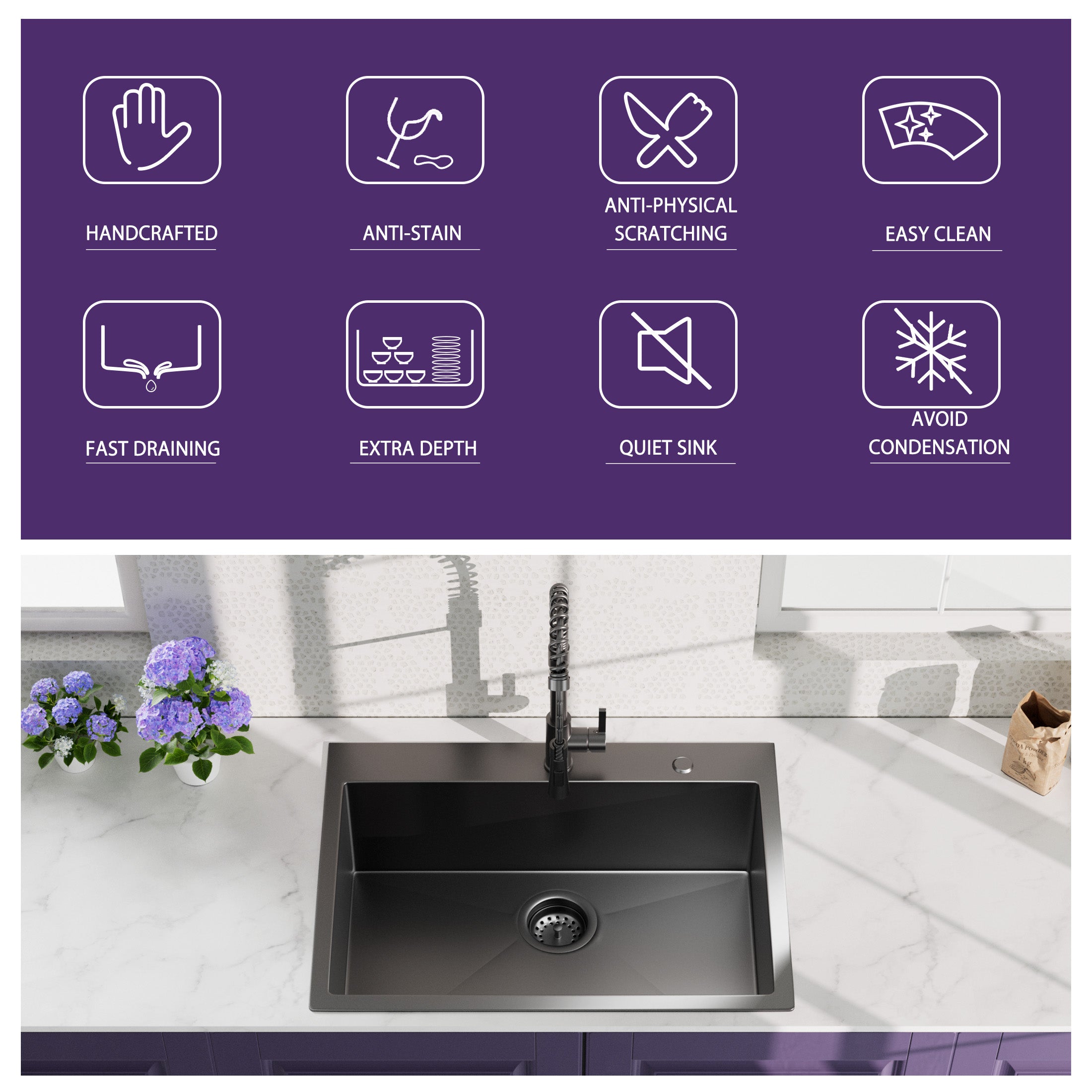 • Heavey duty: This gunmetal black top mount kitchen sink is constructed with premium 304 stainless steel, which is highly resistant to corrosion and dents.