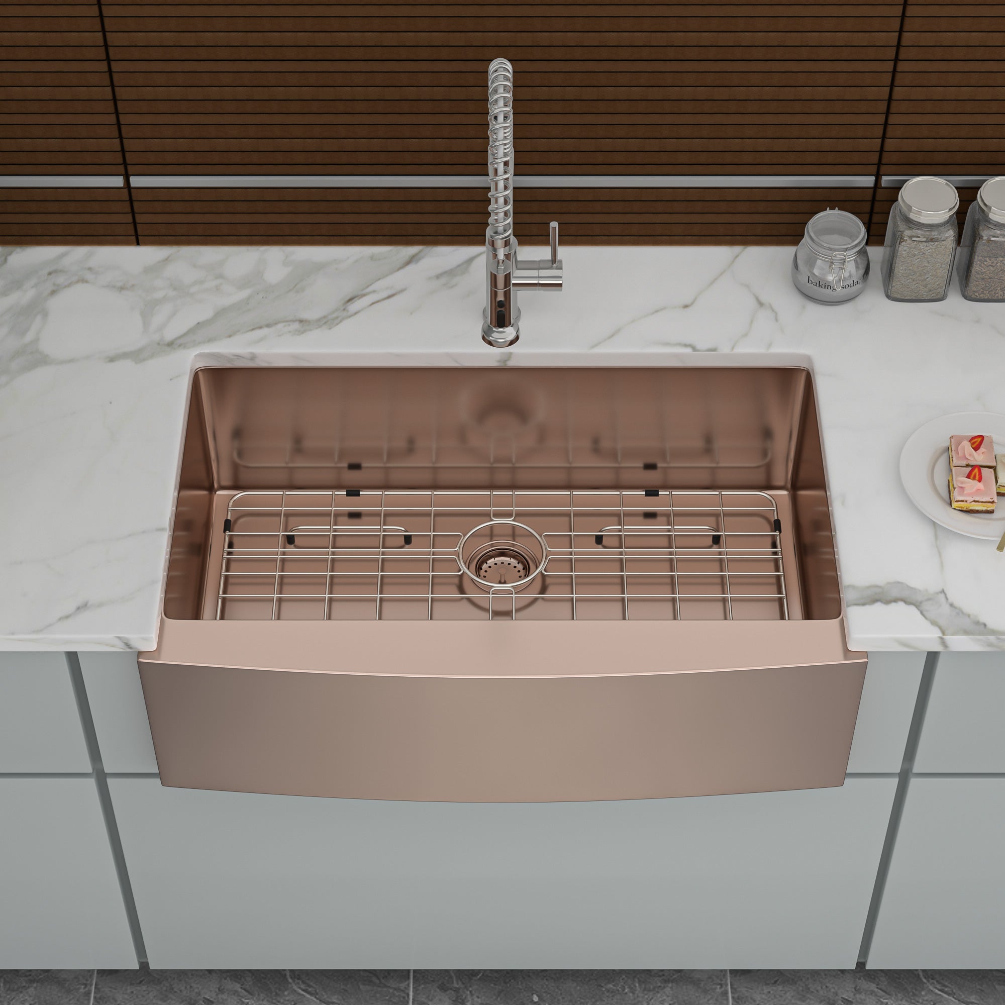 • Package Includes: Package comes in Rose Gold farmhouse kitchen sink, roll-up rack, bottom rinse grid, installation clips, 3.5” strainer drain,Installation Guide.