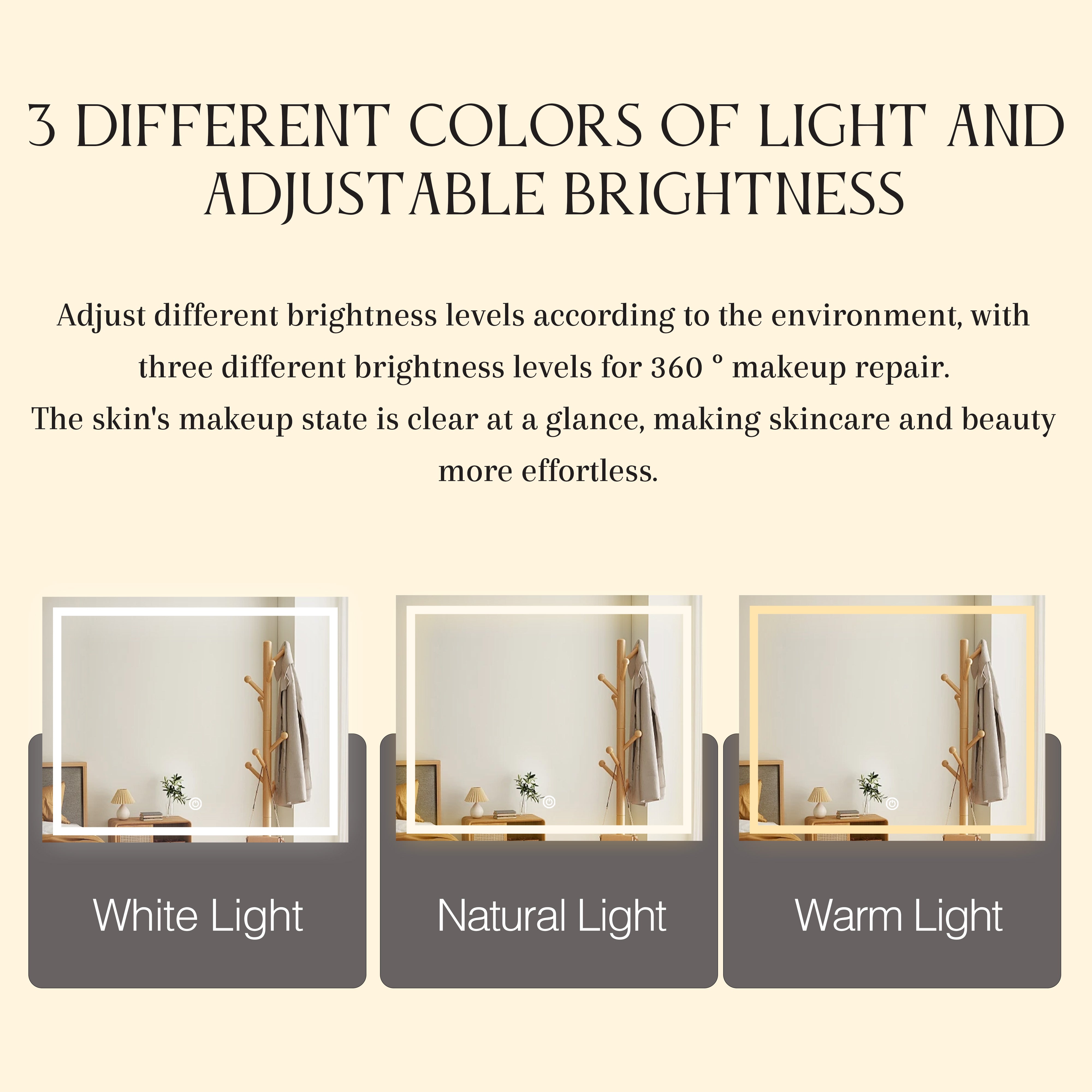 • 1.Flip LED Light Mirror:The mirror of this dressing table is equipped with 3-colour LED smart dimmer strip at the corners,just by touching the sensor switch on the screen,the light will be on,you can easily switch between white,warm and natural light to meet different make-up and skincare needs.