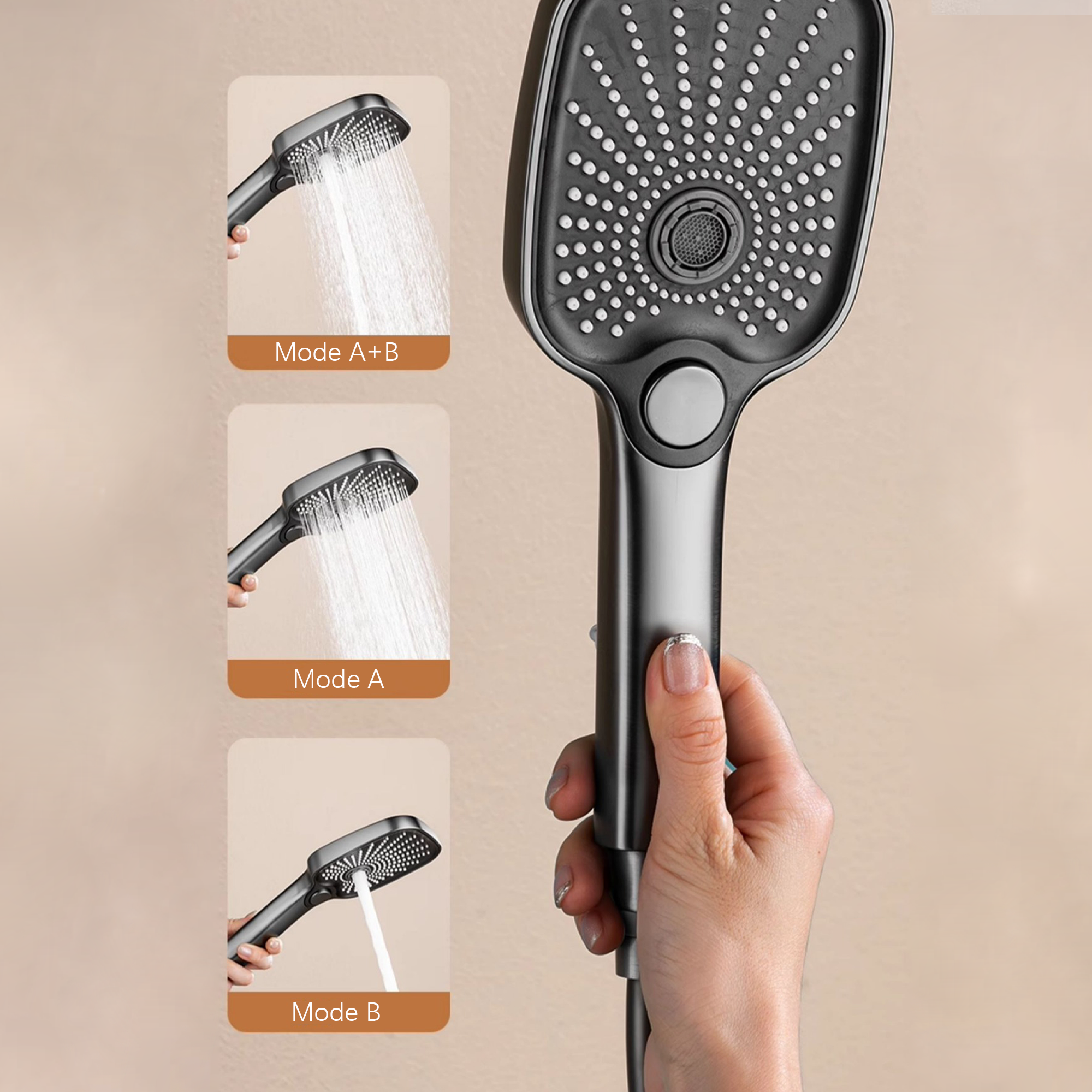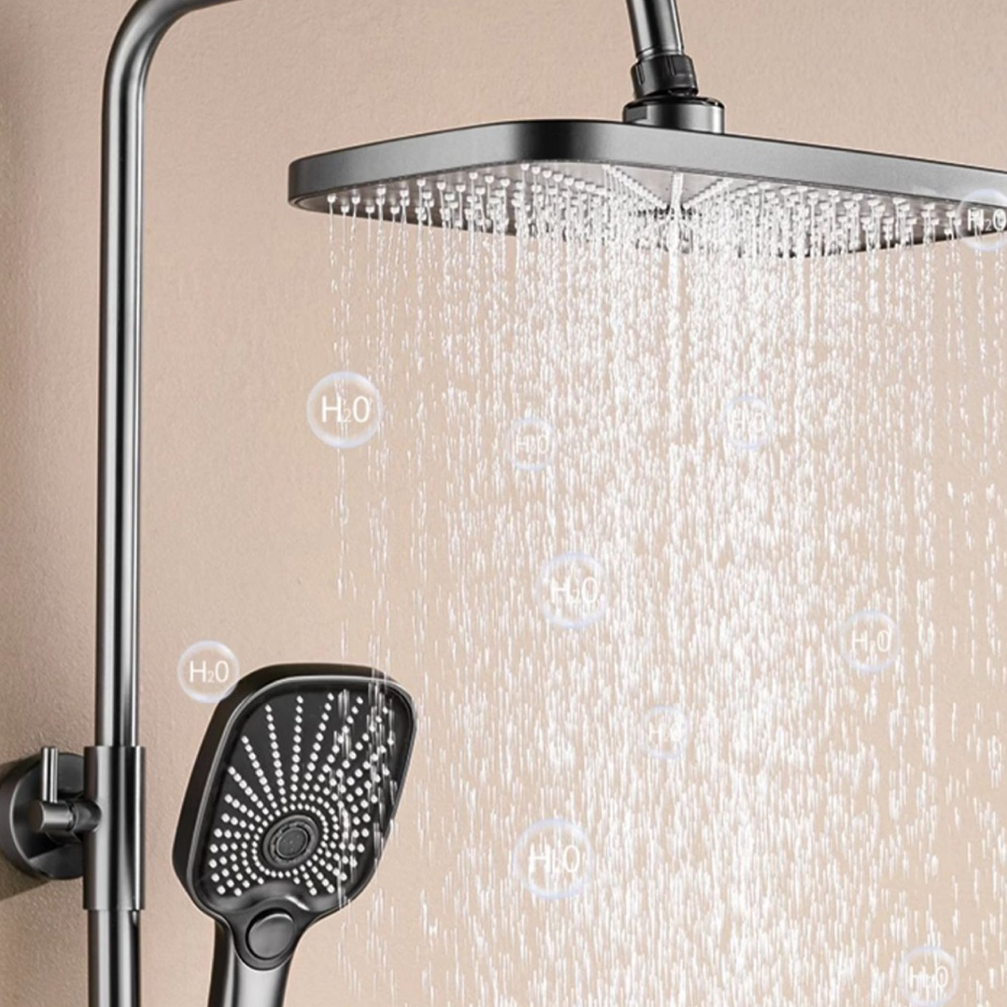 2. Overhead shower with super large diameter, silicone water outlet, self-cleaning needle pops out automatically, and the water flow is smooth and not blocked. 360°rotation adjustment to adjust the comfortable water outlet angle. The hand shower has 3 adjustable settings including Rain, Mist and Pulse.