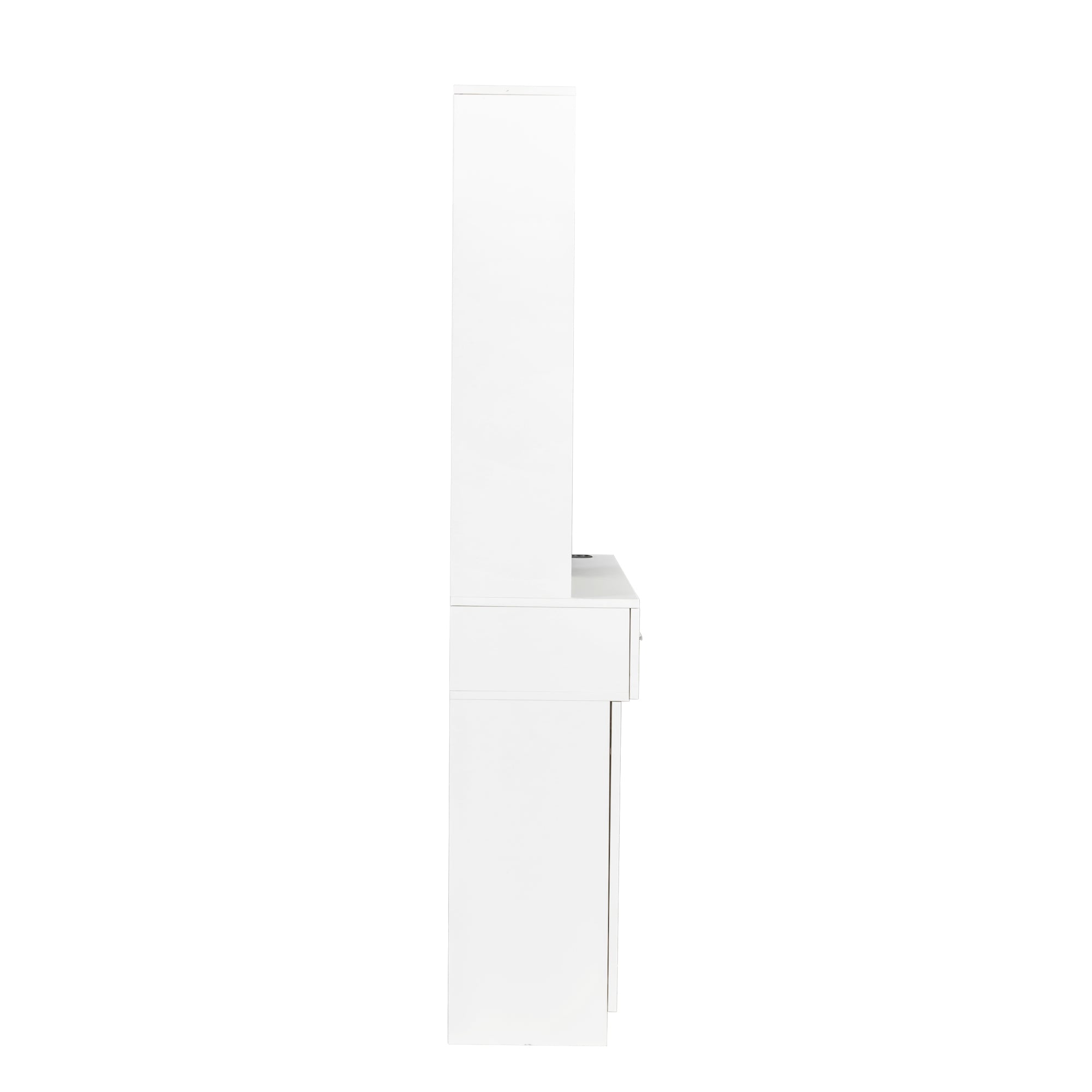 Product size W39.76*D13.19*H66.93 Net weight 70.55lbs Made of high quality particleboard, wooden cabinets are easy to clean, good hardness, high strength and durable Three-dimensional multi-layer storage, space saving, can place a variety of cosmetics and hair dressing toiletries Two enclosed drawers and a large cabinet add storage space for a variety of items and remove clutter from the desk Table top with 3 round holes for hair dryer and other items Overall simple atmosphere, can be placed in the bedroom, toilet and other places, can also be used as a barber shop Material:Material is 15mm particle bpard,back board is 3mm MDF.Made of wooden structure with melamine finish for durability and easy maintenance. Aufgrund des Lichts oder der Anzeige kann die Farbe des tatsächlichen Produkts geringfügig vom Bild abweichen.