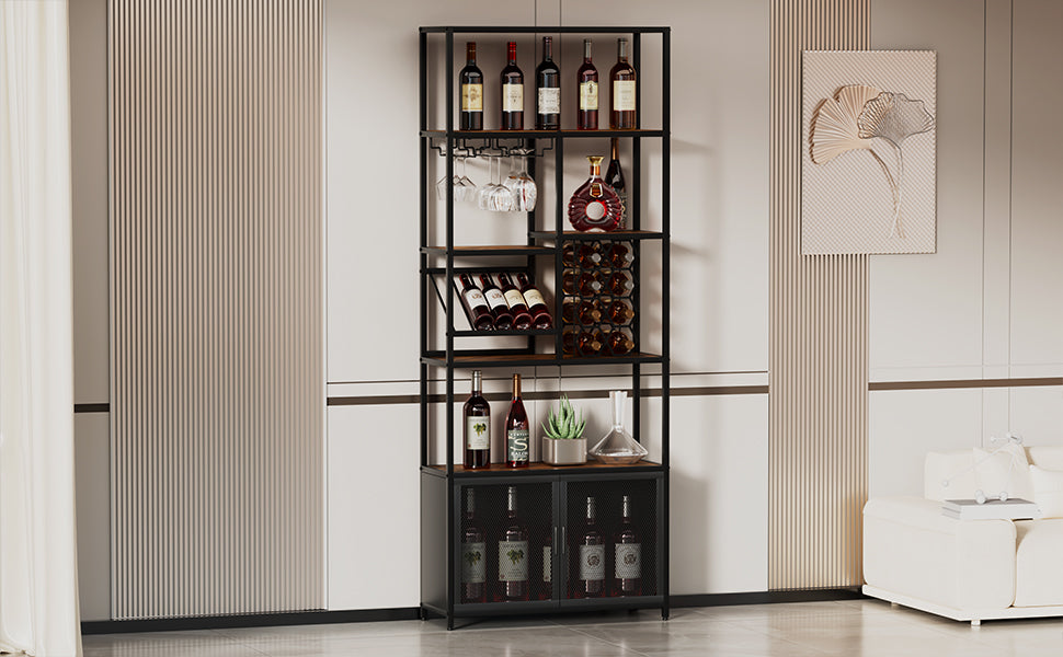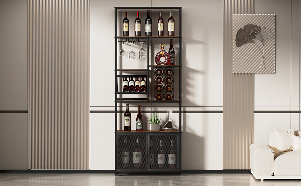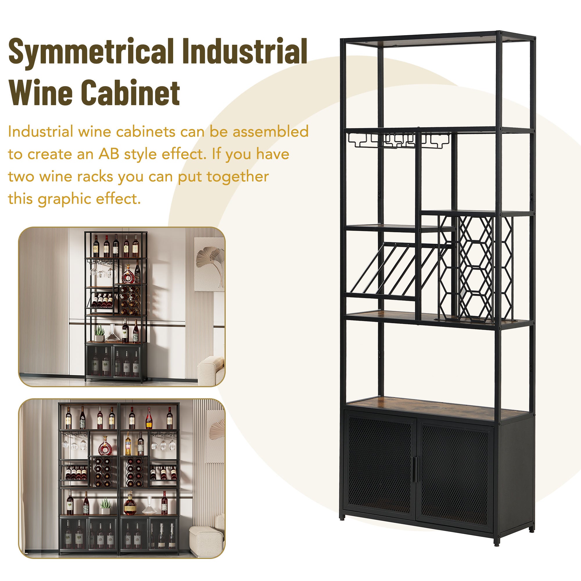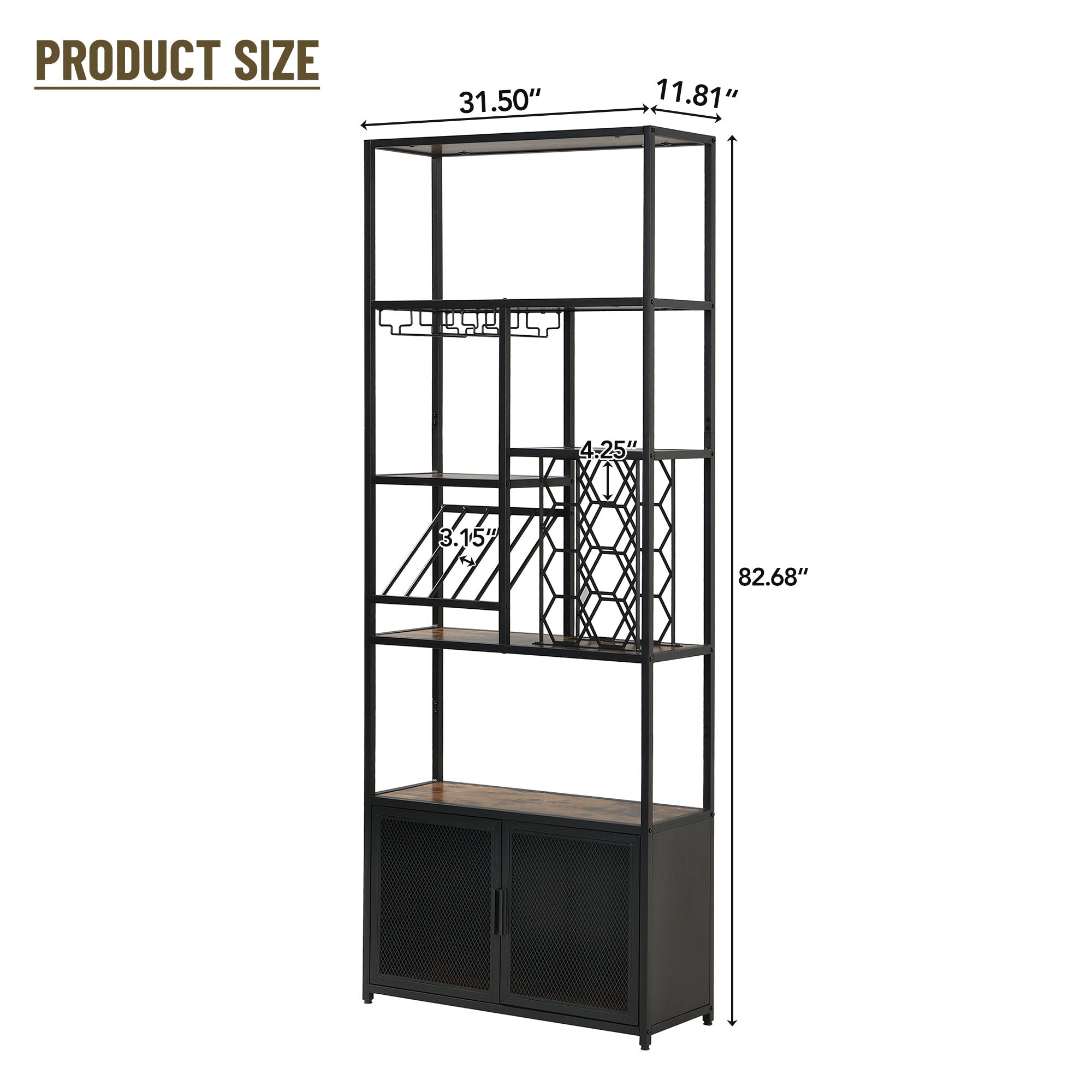 82.7" Industrial Standing Wine Rack with Glass Rack Tall Freestanding Floor Bar Cabinet