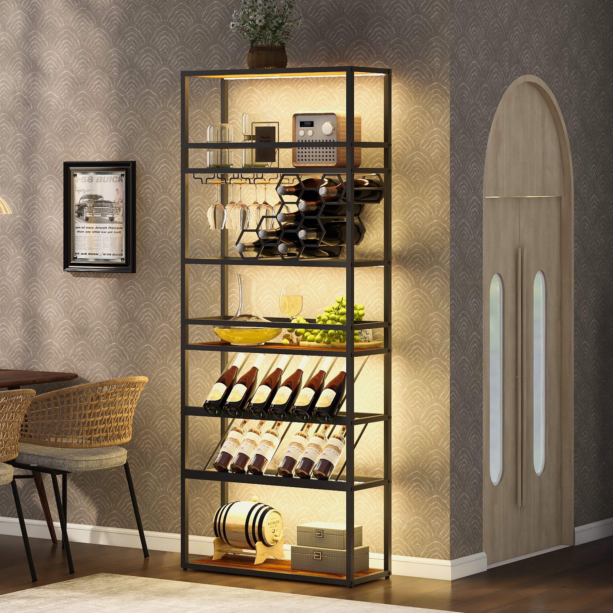 LED Tall Wine Rack Freestanding Floor, 7-Tier Wine Baker Rack With Glass Holder & Wine Storage, Industrial Wine Display Shelf Wine Bar Cabinet For Bar, Kitchen, Dining Room