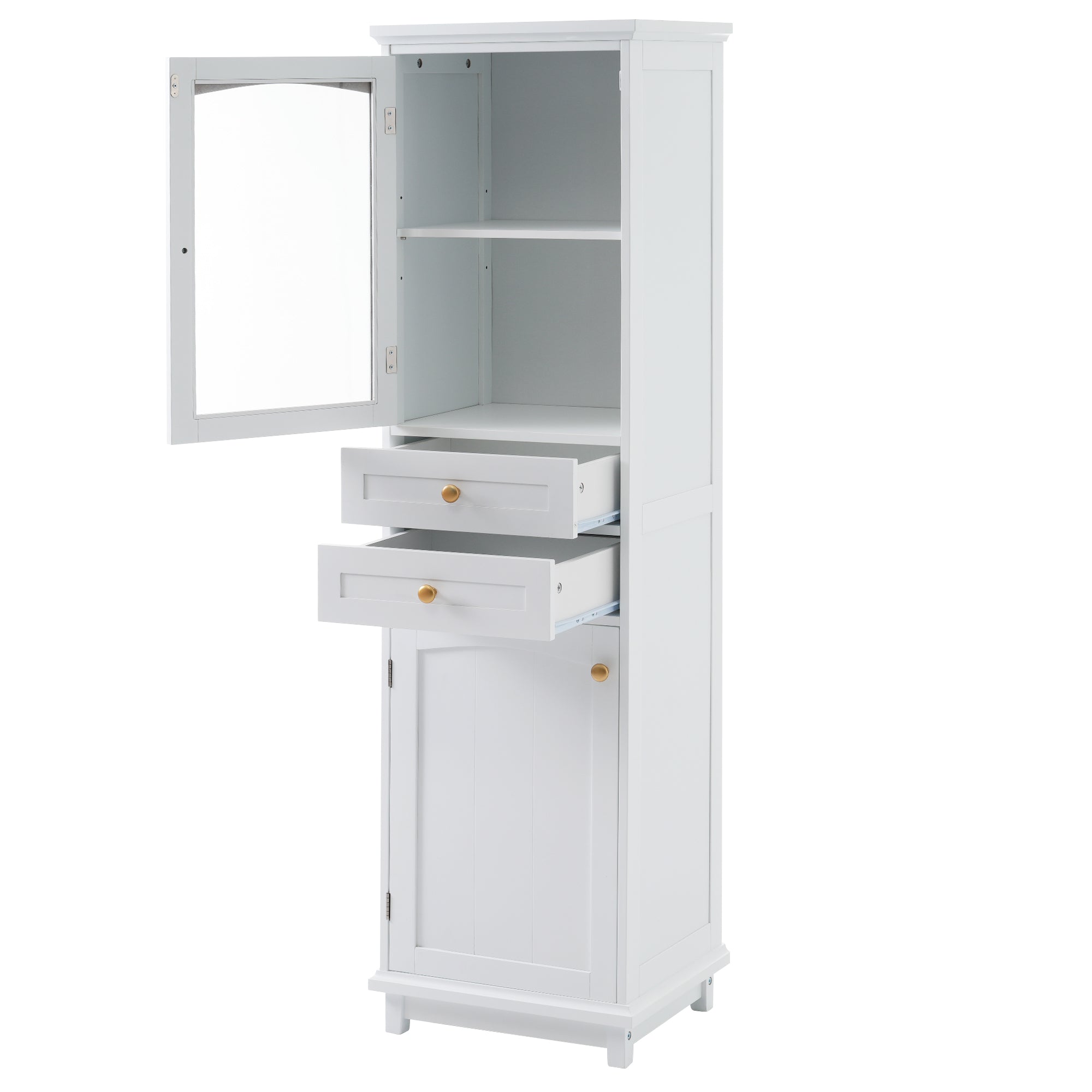 63" Tall Bathroom Storage Cabinet with Glass Doors, Free-Standing, Two Drawers, and Adjustable Shelves, MDF Board, Painted white - Perfect for Displaying Your Favorite Items